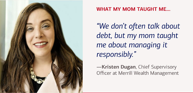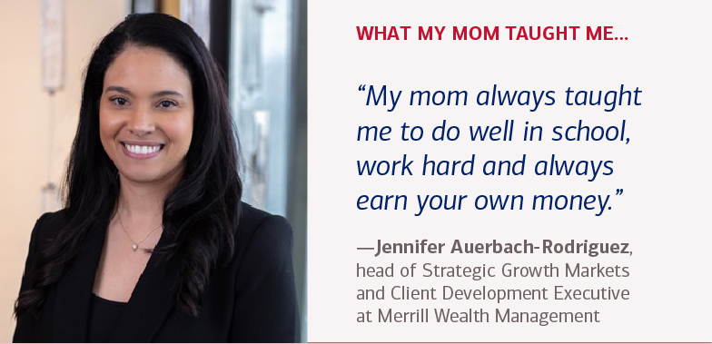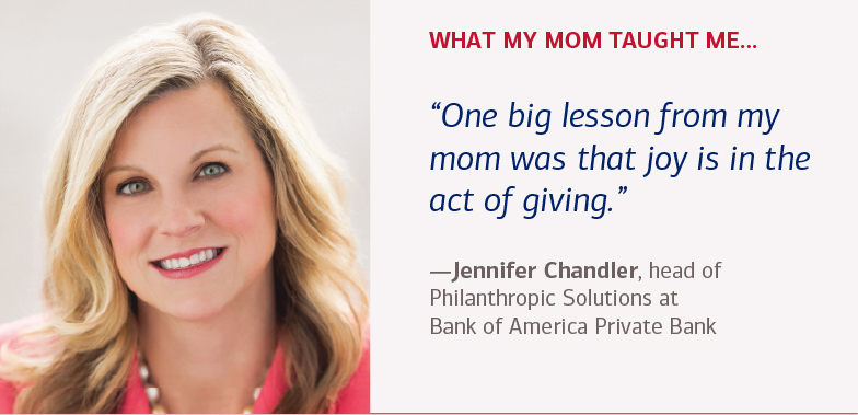 Your approach to money likely has its roots in childhood when your parents passed on valuable financial lessons. Every mom has her own methods for creating teachable financial moments, says Jennifer Chandler, head of Philanthropic Solutions at Bank of America Private Bank. “My mother had very little but always gave back to others. She stressed the value of working hard for the things you want and learned to be very creative with the little we had. If I wanted something, I knew I had to work for it.”