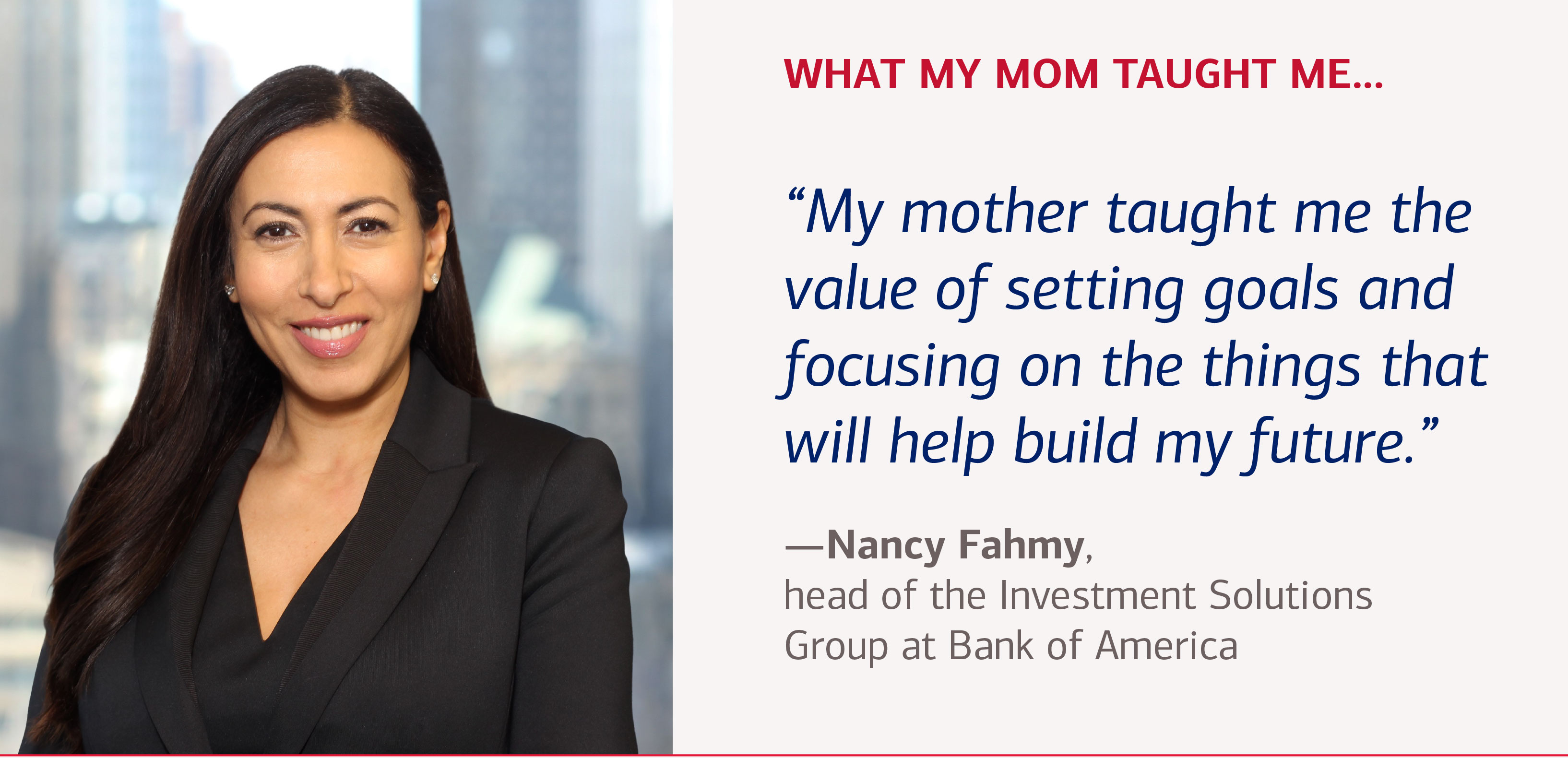 The most valuable money lesson Fahmy’s mother taught her was to invest in herself. For her, that meant pursuing an education. Her mother had paused her own career after having three children. “However,” says Fahmy, “it was very important to her that her daughters had the best education so they could stand on their own feet and achieve financial independence.”